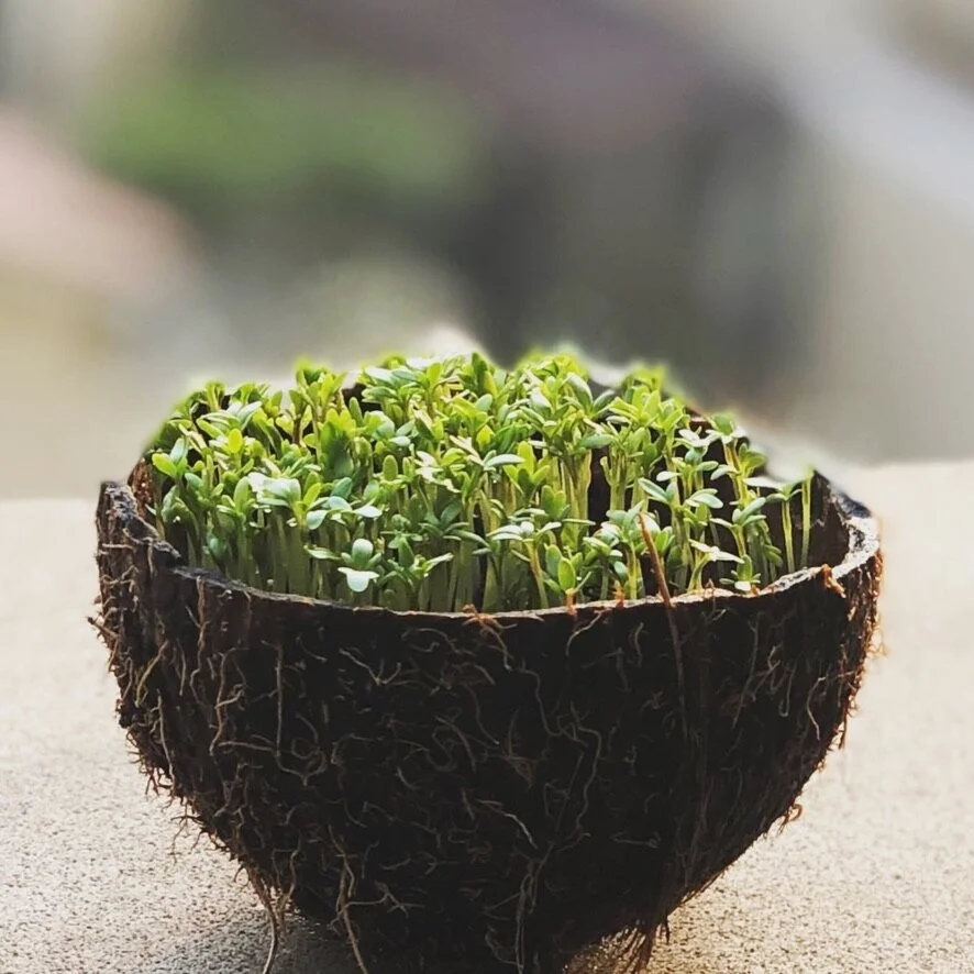 Microgreens growing in a coconut shell